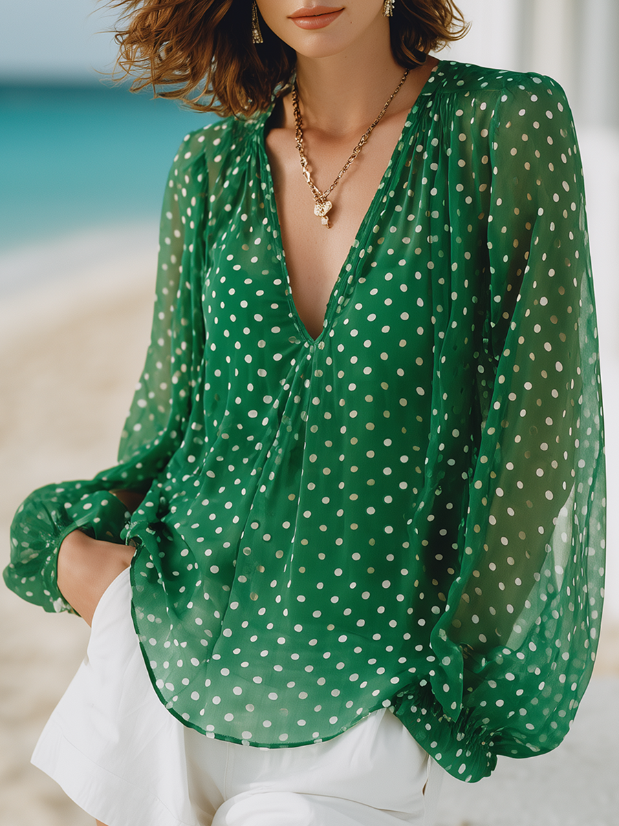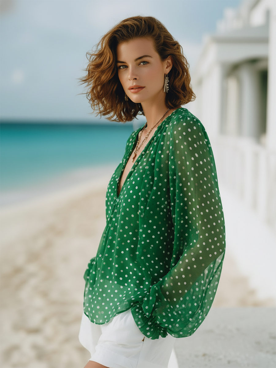 Resort-style Green Polka Dot V-neck Long-sleeved Top