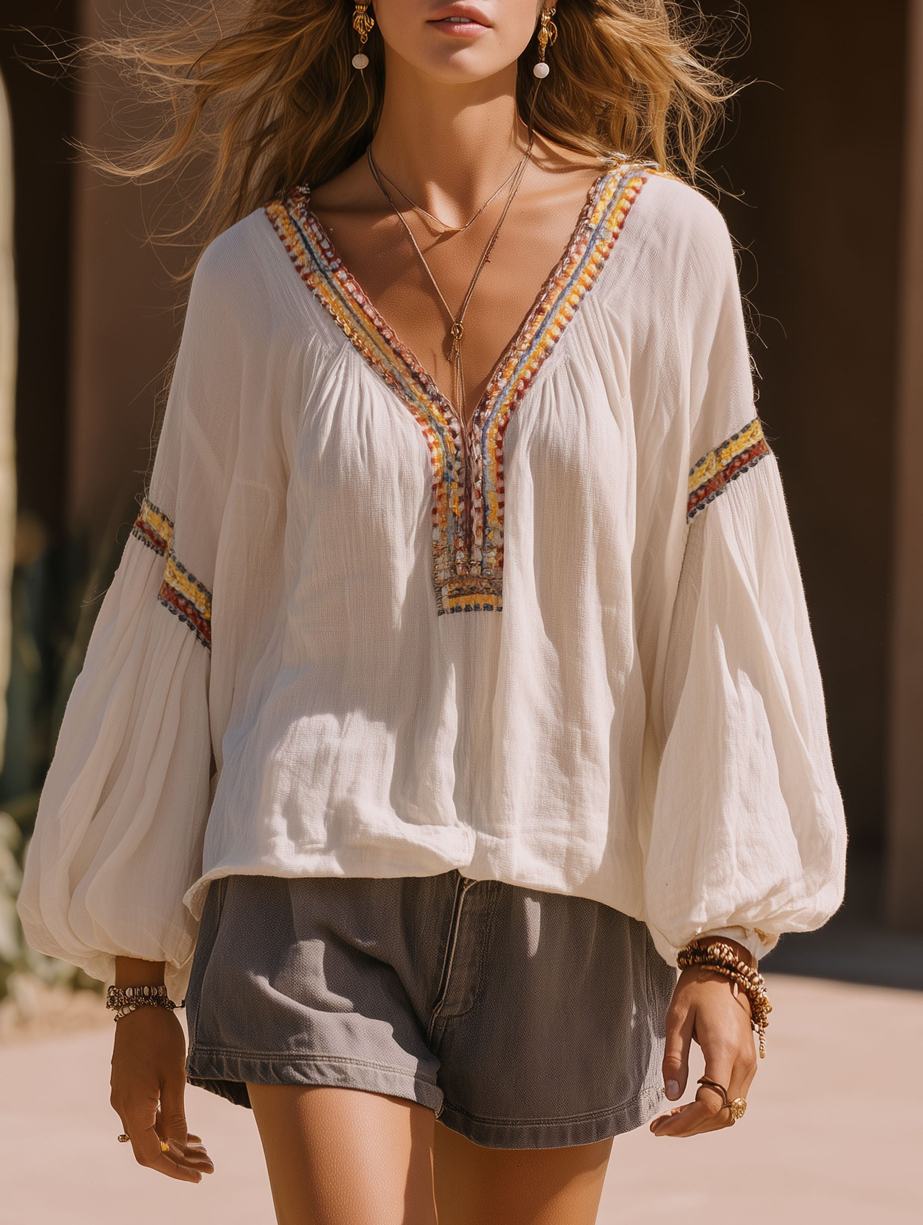 Resort-style Cotton V-neck Long-sleeved Trouser Set