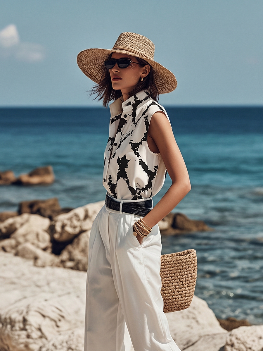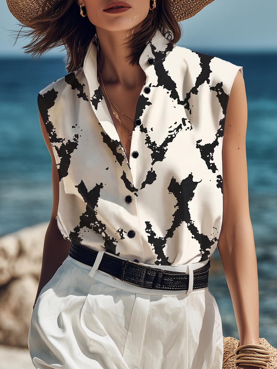 Chic Vacation Sleeveless Geometric-Print Satin Shirt