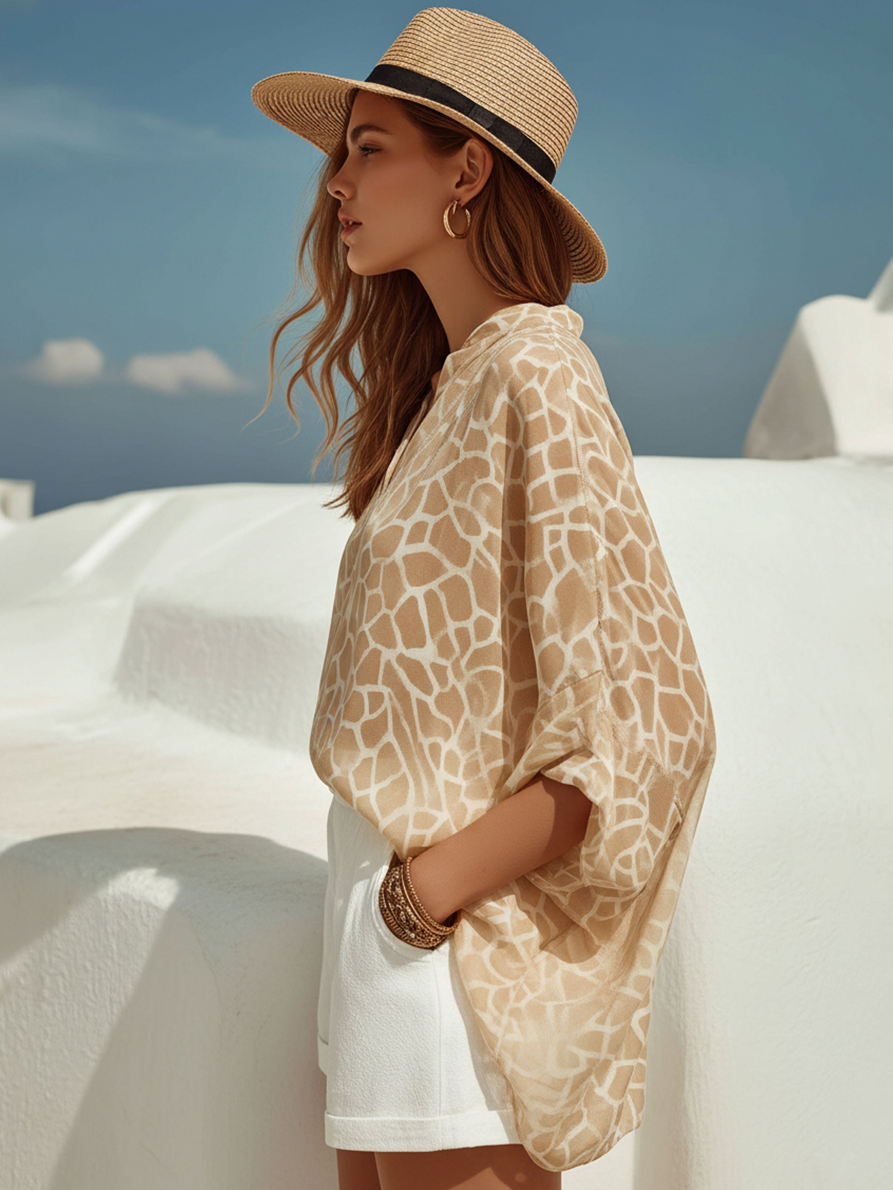 Elegant Vacation-Style Beige Chiffon V-Neck Khaki Printed Mid-Sleeve T-Shirt