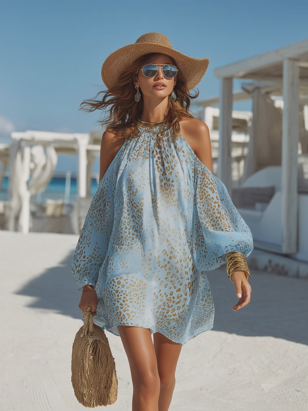 This romantic bohemian mini dress balances wild charm with graceful allure. Crafted from lightweight blue chiffon, it features an off‑shoulder neckline that highlights the collarbones, complemented by long, flowy sleeves for a soft, dreamy effect. The subtle leopard print adds intrigue and texture, blending boho spirit with a hint of bold sophistication.